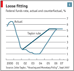 The third contributor to the global liquidity boom was the monetary policies of the U.S. Federal Reserve Board. These policies turned what could have been a self-correcting housing cycle into a massive housing bubble. This bubble burst with the U.S. subprime crisis by late 2006. The impact on the global financial system spread quickly via mortgage-related securities in early 2007 and lead to the first severe global liquidity crisis of August 2007. Figure 3, originally published by The Economist, illustrates the excessive easing of U.S. monetary policy and draws on work by John Taylor (2007), who had examined Federal Reserve policy decisions—in terms of the federal funds interest rate—from 2000 to 2006. The line that dips down to 1 percent in 2003 stays there into 2004 and then rises steadily until 2006 shows the actual interest rate decisions of the Federal Reserve. The other line, labeled the “Taylor rule,” shows what the interest rate should have been if the Fed had followed the type of policy that it had followed fairly regularly during the previous 20-year period of good economic performance. As Figure 3 illustrates, and John Taylor and other monetary economist have argued, the U.S. Federal Reserve Open Market Committee set inappropriately low Federal Funds Rates from 2002 to 2006. Adjusted for inflation, these rates were even negative in real terms in 2002 and 2003.
