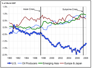 The second major contributor to the global financial crisis has been the increasing imbalances in the global economy as the U.S. current account deficit deteriorated faster after the Asia crisis, as seen in Figure 2, where the U.S. current account deficit is covered by savings from Emerging Asia, oil producing countries, Japan and part of Europe.