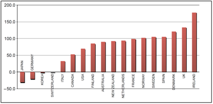 At the beginning of the present decade, the Bank of International Settlements (BIS), the OECD, and the IMF began to notice the sustained rise of housing prices in a growing number of industrial countries and the increasing synchronization of these housing price booms. The IMF in its World Economic Outlook of September 2004 documented and analyzed the co-movement of house prices across 18 industrialized countries from 1980 to 2003. France, Sweden, U.K., and the United States were found to be most strongly correlated with other countries, while Denmark, Germany and Italy exhibited the weakest correlations. Separately, Robert Shiller showed that the national U.S. house price boom since the mid-1990s was unprecedented in U.S. history, where real house prices had been flat for most of the century. U.S. housing prices were rising even faster after 2002 (Shiller 2005 and 2007). There are significant international comparability problems for housing prices. [1] Nonetheless, alternative housing price indices all show that the U.S. housing price boom was toward the lower end of these housing price booms as Figure 4 shows. Yet the U.S. housing system was at the epicenter of the global financial crisis.